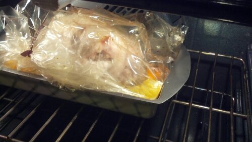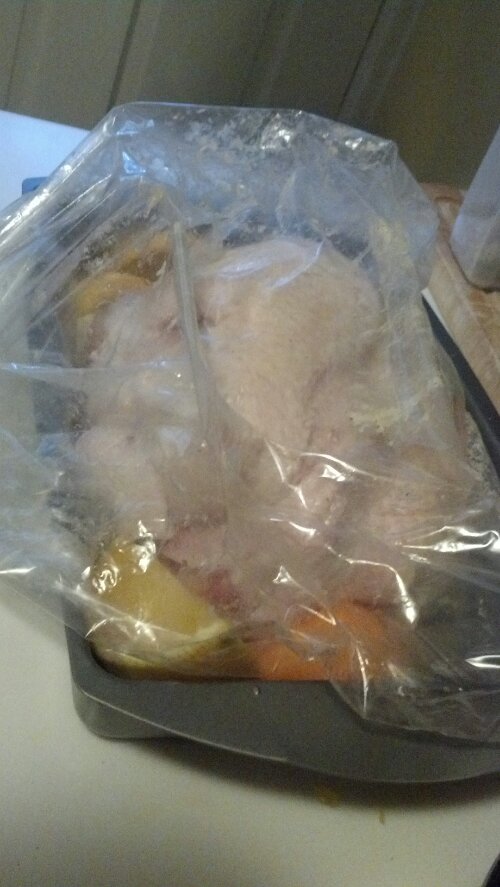 Turkey – 4-6lb turkey breast est. 2 hours cooking in oven bag. Seasonings brineing, butter, salt/pepper rubbed, stuffed/rubbed with oranges & cloves